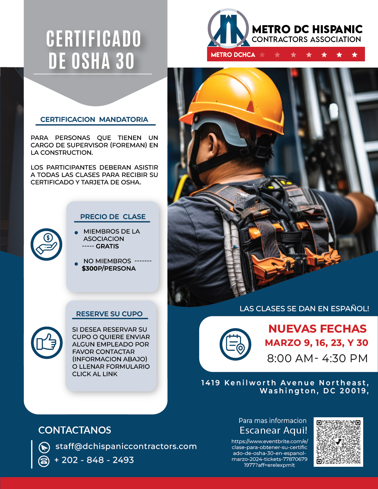 Las clases se dan en Espanol. Si desea reservar su cupo o quiere enviar algún empleado por favor llenar este formulario o llamar al 202-848-2493 o staff@dchispaniccontractors.com.